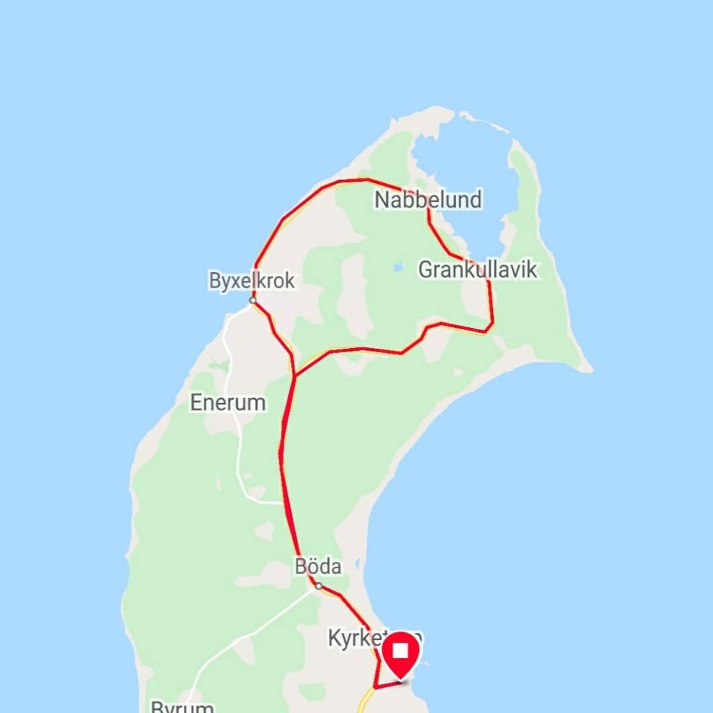 Kartbild över slingan där start och mål är i Böda Hamn. Naturligtvis kan ett alternativ vara att utgå ifrån Byxelkrok och köra en lite korta rundslinga med start och stopp i Byxelkrok hamn.